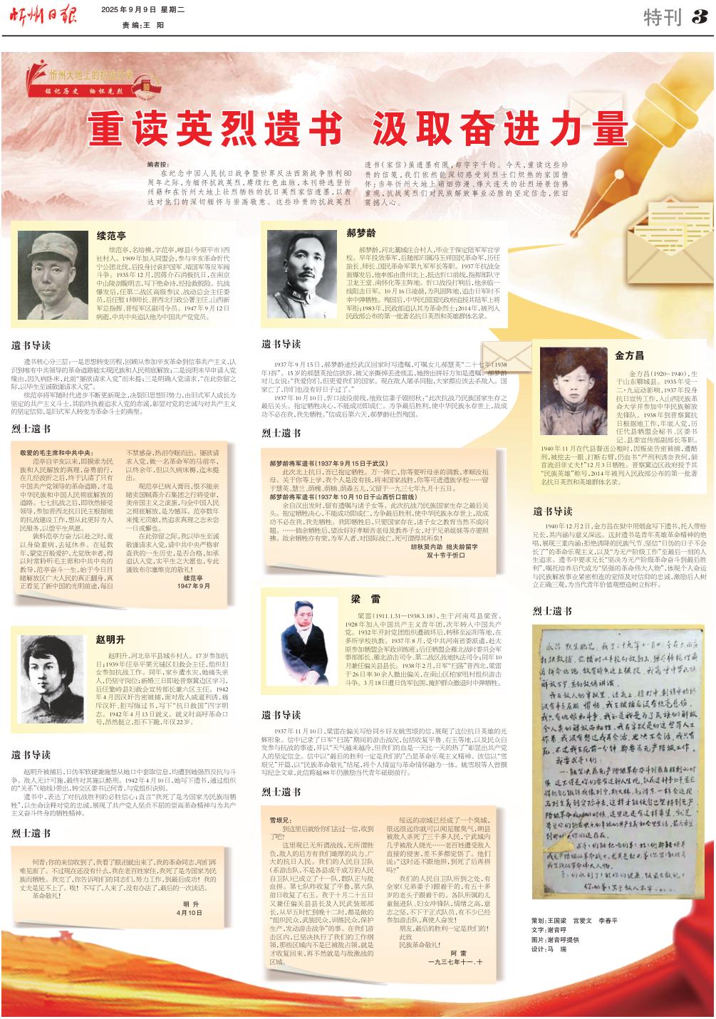 在紀(jì)念中國(guó)人民抗日戰(zhàn)爭(zhēng)暨世界反法西斯戰(zhàn)爭(zhēng)勝利80周年之際,為緬懷抗戰(zhàn)英烈,賡續(xù)紅色血脈,本刊特選登忻州籍和在忻州大地上壯烈犧牲的抗日英烈家信遺墨,以表達(dá)對(duì)他們的深切緬懷與崇高敬意。這些珍貴的抗戰(zhàn)英烈遺書(家信)雖遺墨有限,卻字字千鈞。今天,重讀這些珍貴的信箋,我們依然能深切感受到烈士們熾熱的家國(guó)情懷:當(dāng)年忻州大地上硝煙彌漫、烽火連天的壯烈場(chǎng)景仿佛重現(xiàn),抗戰(zhàn)英烈們對(duì)民族解放事業(yè)必勝的堅(jiān)定信念,依舊震撼人心。