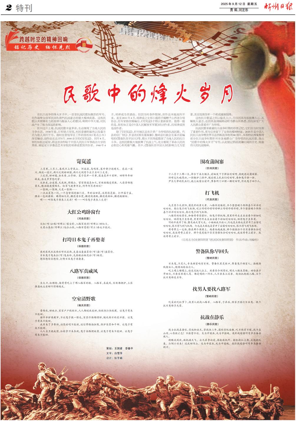 抗戰(zhàn)民歌承載著抗日戰(zhàn)爭時期的珍貴記憶,它們在當時發(fā)揮了重要作用,更為后世留下了寶貴的精神財富。2025年是中國人民抗日戰(zhàn)爭暨世界反法西斯戰(zhàn)爭勝利80周年,本報特此搜集整理部分抗日戰(zhàn)爭時期忻州市各地群眾廣為傳唱的抗戰(zhàn)民歌,推出“民歌中的烽火歲月”專刊,以此銘記那段波瀾壯闊的歷史,致敬偉大的抗戰(zhàn)精神。