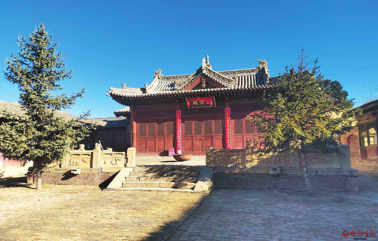 一進(jìn)院布局,中軸線(xiàn)現(xiàn)存有正殿1棟,兩側(cè)建有配殿,西北角建有偏殿。正殿磚砌臺(tái)基,面寬五間,進(jìn)深六椽,七檁前后廊式構(gòu)架,前檐斗拱為五踩,后檐為三踩斗拱,單檐懸山頂。前設(shè)月臺(tái),建有抱廈三間,單檐歇山頂。現(xiàn)新塑像3尊,正殿梁架有彩繪。