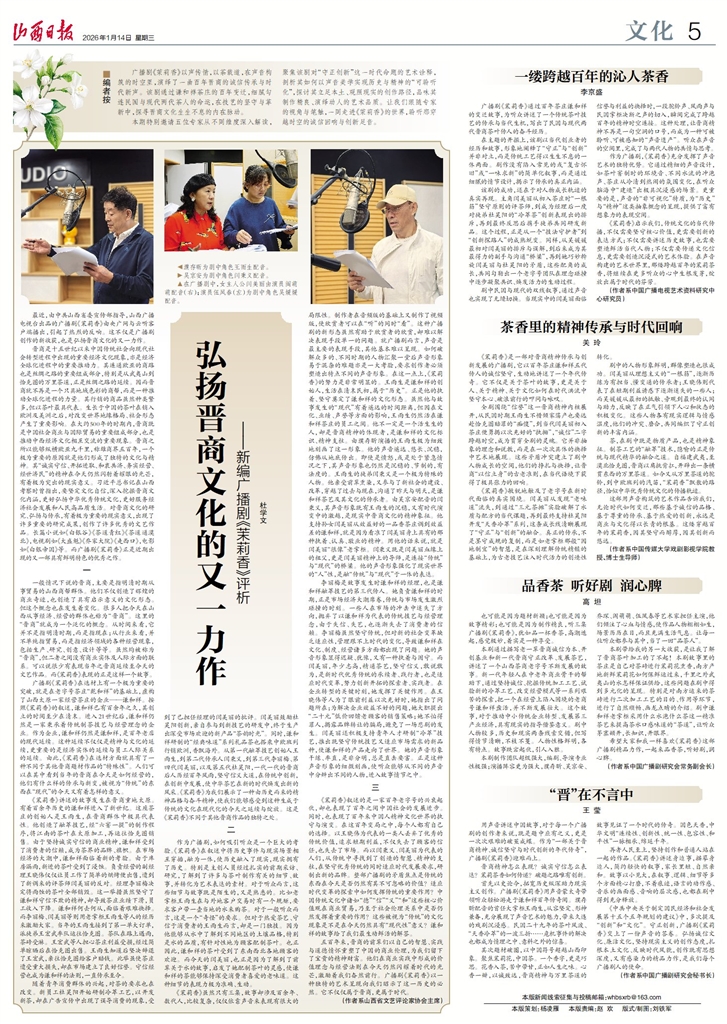 晉商是十五世紀以來中國傳統(tǒng)社會向現(xiàn)代社會轉(zhuǎn)型進程中出現(xiàn)的重要經(jīng)濟文化現(xiàn)象,亦是經(jīng)濟全球化進程中的重要推動力。其連通歐亞的商路也是絲綢之路的重要組成部分,特別是從武夷山到恰克圖的萬里茶道,正是絲綢之路的延續(xù)。因而晉商就不再是一個只具地域色彩的商幫,而是一種推動全球化進程的力量。其行銷的商品雖然種類繁多,但以茶葉最具代表。生長于中國的茶葉在銷入歐洲及美洲之后,對改變世界地緣格局、社會形態(tài)產(chǎn)生了重要影響。在大約500年的時期內(nèi),晉商既是中國社會商業(yè)與國際貿(mào)易的重要組成部分,也是推動中西經(jīng)濟文化相互交流的重要現(xiàn)象。晉商之所以能夠縱橫歐亞九千里,稱雄商界五百年,一個極為重要的原因就是他們形成了獨特的文化與精神。其“誠實守信、開拓進取、和衷共濟、務(wù)實經(jīng)營、經(jīng)世濟民”的精神在今天仍然閃射著耀眼的光芒,有著極為突出的現(xiàn)實意義。習(xí)近平總書記在山西考察時曾指出,要堅定文化自信,深入挖掘晉商文化內(nèi)涵,更好弘揚中華優(yōu)秀傳統(tǒng)文化,更好服務(wù)經(jīng)濟社會發(fā)展和人民高品質(zhì)生活。對晉商文化的研究、弘揚與傳承,有著極為重要的現(xiàn)實意義,出現(xiàn)了許多重要的研究成果,創(chuàng)作了許多優(yōu)秀的文藝作品。長篇小說如《白銀谷》《茶道青紅》《茶道通漠北》,電視劇如《大盛魁》《喬家大院》《走西口》,電影如《白銀帝國》等。而廣播劇《茉莉香》正是近期出現(xiàn)的又一部具有鮮明特色的優(yōu)秀之作。