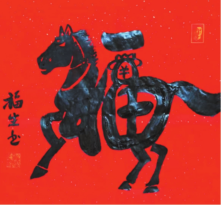 生肖文化,是中華民俗之根脈,王福生緊扣福字主題,應(yīng)時(shí)而作,應(yīng)物而書(shū),將十二生肖意象與福字完美融合,創(chuàng)作出獨(dú)具氣象的“生肖福”系列,合于《道德經(jīng)》“動(dòng)善時(shí)”的智慧——順天時(shí),合地利,應(yīng)人心,與時(shí)俱化。其馬年“馬上?!笨胺Q(chēng)福字神品:以草書(shū)筆勢(shì),將“?!迸c“馬”渾然合一,“礻”為駿馬昂首,鬃毛飛揚(yáng);“畐”為身軀矯健,奮蹄向前;“田”化為鞍飾,點(diǎn)睛傳神。整幅福作一氣呵成,筆走龍蛇,靈動(dòng)奔放,卻又穩(wěn)而不飄,勁而不躁,正是老子“知其雄,守其雌”的筆墨體現(xiàn)。
