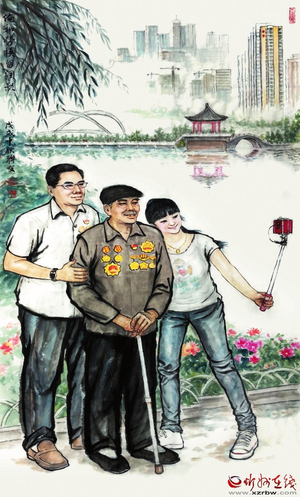 我與功勛留個影,榮光虎勁駐心湖。