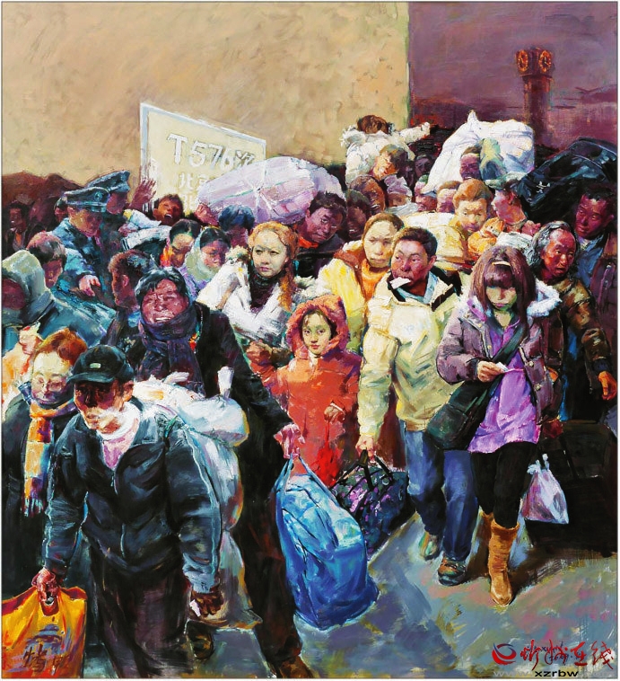《春潮——回家過年》這幅作品是典型、真實(shí)的社會(huì)現(xiàn)實(shí)和人性本真的寫照,這個(gè)瞬間定格了一段讓多少人刻骨銘心的記憶,敘述了周期性的人類大遷徙——春運(yùn)。該畫所蘊(yùn)涵的是中國人心中那份最飽滿的希望。旅客是彼此都不認(rèn)識(shí)的陌生人,為了一個(gè)回家的目的,毫無距離地?cái)D在一起,人物個(gè)性鮮明。畫家具有強(qiáng)大的創(chuàng)作能力和藝術(shù)表現(xiàn)力。(邢晨聲 文)
