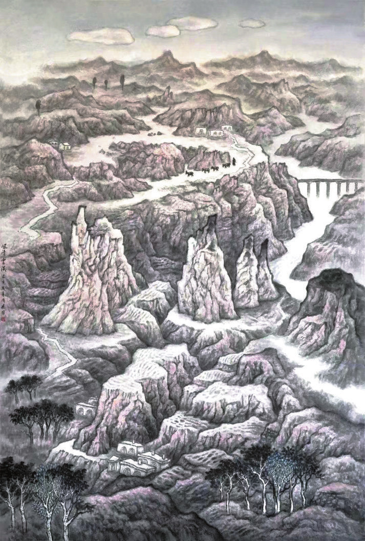 周建國(guó)對(duì)中國(guó)山水畫有著獨(dú)特見解,出版過畫集《中國(guó)美術(shù)名家精品鑒賞·周建國(guó)作品集》。他的創(chuàng)作之路主要分為兩個(gè)時(shí)期,前期追求中西融合,后期則回歸傳統(tǒng)。前期作品《曉月》《古原除夕》《月色》等,多取材于黃土高原,真切流露出其對(duì)黃土地的深情厚愛:早上飄起的炊煙演繹著百姓的勤勞,喧鬧的腰鼓彰顯著鄉(xiāng)民熱愛生活的豪情,晨起上課的學(xué)生更是承載著當(dāng)?shù)厝藵M滿的希望。周建國(guó)將黃土地上的一草一木皆升華為獨(dú)特且富有個(gè)性的生命體,畫面處理側(cè)重將西方油畫的光影巧妙融入作品,寓動(dòng)于靜,動(dòng)靜相宜,彰顯“高貴的單純,靜穆的偉大”的內(nèi)在張力。同時(shí)將傳統(tǒng)山水繪畫的造型、空間結(jié)構(gòu)、筆法設(shè)色皆進(jìn)行改變——黃土溝壑的幾何化處理、筆墨色調(diào)的反復(fù)拿捏、耐人尋味的空間布局,都體現(xiàn)了其特殊的創(chuàng)作理念。相較前期,周建國(guó)后期的作品更加注重對(duì)內(nèi)在美的挖掘,如《風(fēng)月同天》《家園》《和諧家園》《生息之地》《太行月色》等代表作品,表達(dá)對(duì)祖國(guó)山河大川的熱愛,走“外師造化,中得心源”之道,畫風(fēng)趨向率真,試圖突破中國(guó)山水繪畫的表象審美,追尋深層意義的表達(dá)。