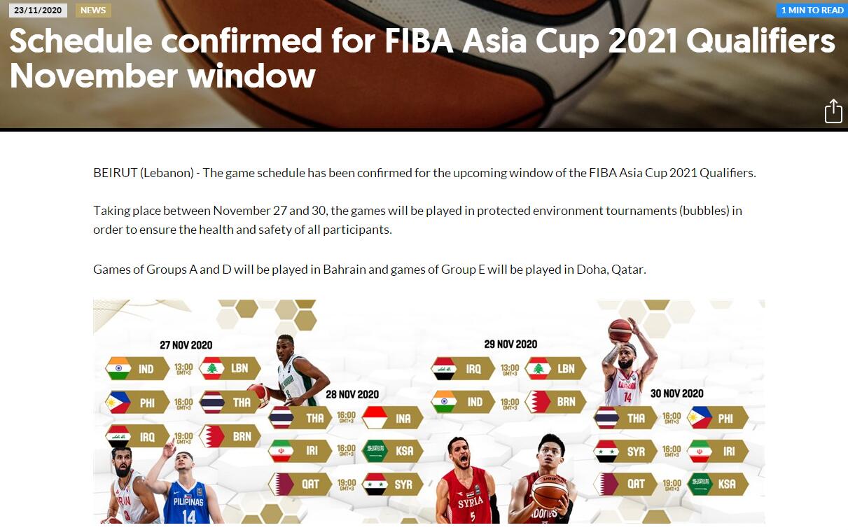 官方網(wǎng)站截圖 據(jù)介紹,由于相關(guān)防疫規(guī)定,有些國(guó)家和地區(qū)籃協(xié)所屬政府當(dāng)局不允許球隊(duì)進(jìn)行國(guó)際旅行,進(jìn)而導(dǎo)致有些球隊(duì)無(wú)法參加本窗口期比賽,國(guó)際籃聯(lián)被迫對(duì)亞洲杯預(yù)選賽11月窗口期賽程進(jìn)行調(diào)整。 本次國(guó)際籃聯(lián)亞洲杯預(yù)選賽共分為6個(gè)小組,每個(gè)小組4支球隊(duì),小組前兩名可以直接獲得正賽資格,各小組第三名展開(kāi)資格賽較量,爭(zhēng)奪最后4個(gè)席位,亞洲杯正賽將有16支參賽球隊(duì)。此次確認(rèn)的三個(gè)主辦城市分別為巴林首都麥納麥、卡塔爾首都多哈和約旦首都安曼,其中,麥納麥承辦A組、D組的全部比賽,B組、E組的比賽將在多哈進(jìn)行,安曼則承接F組的比賽。至于澳大利亞、新西蘭、關(guān)島、中國(guó)香港所在的C組,暫未確定比賽主辦城市。 此前,國(guó)際籃聯(lián)發(fā)布消息稱,考慮到球員、教練員、工作人員的安全與健康,現(xiàn)階段窗口期比賽取消原本的主客場(chǎng)制,改為在同一賽區(qū)進(jìn)行,比賽將在封閉環(huán)境中進(jìn)行。 (責(zé)任編輯:蔡文斌) |