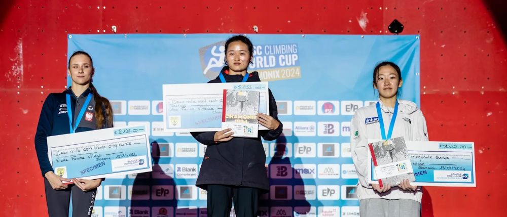 中國選手張少琴(中)在2024攀巖世界杯法國夏蒙尼站中獲得女子速度項(xiàng)目冠軍。圖源:國際攀聯(lián)官網(wǎng)