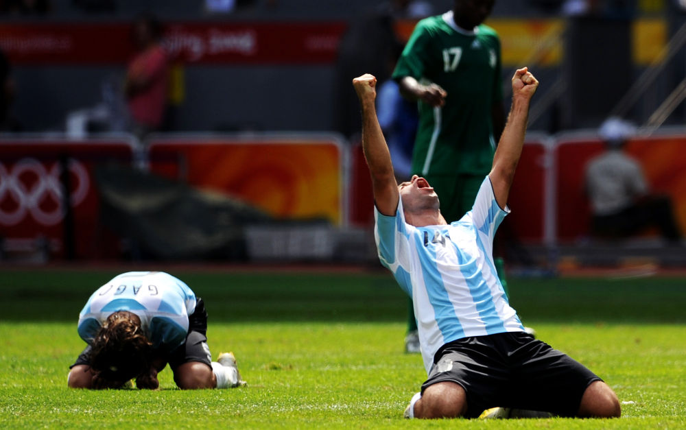 2008年8月23日,阿根廷隊球員馬斯切拉諾(右)慶祝勝利。當(dāng)日,北京奧運(yùn)會男子足球決賽在國家體育場——“鳥巢”舉行,阿根廷隊1:0戰(zhàn)勝尼日利亞隊獲得冠軍。新華社記者 楊磊 攝