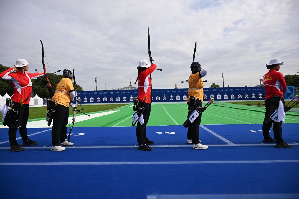 7月25日,巴黎奧運(yùn)會射箭女子個人排位賽在巴黎榮軍院舉行,中國選手楊曉蕾(中)在比賽中。新華社記者 賀燦鈴 攝