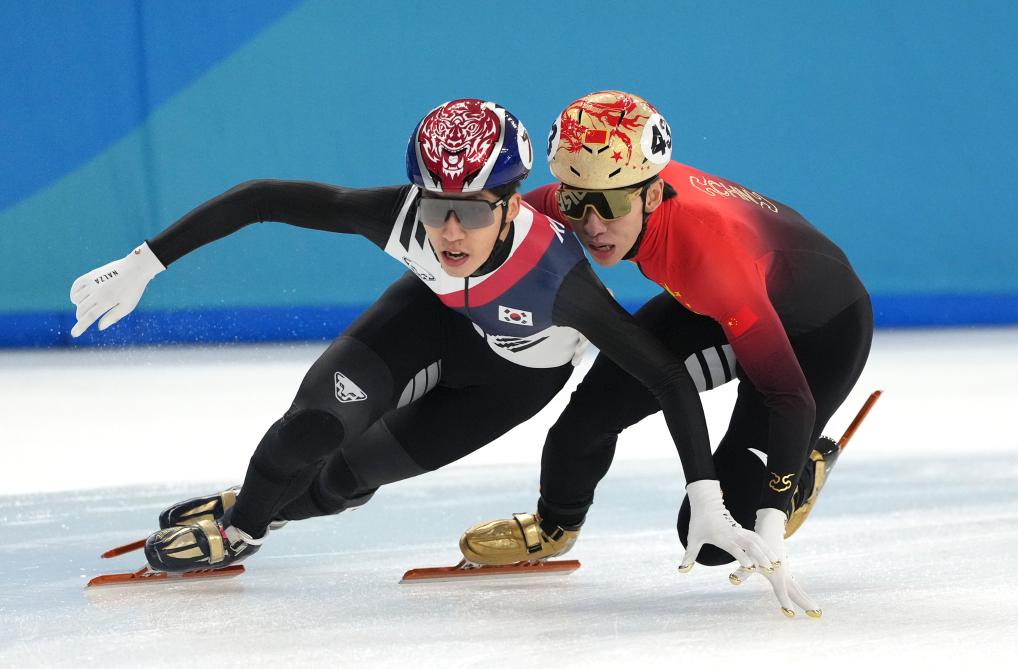 2月9日,中國(guó)隊(duì)選手林孝埈(右)、韓國(guó)隊(duì)選手樸智元在比賽中發(fā)生身體碰撞。新華社記者 顏麟蘊(yùn) 攝