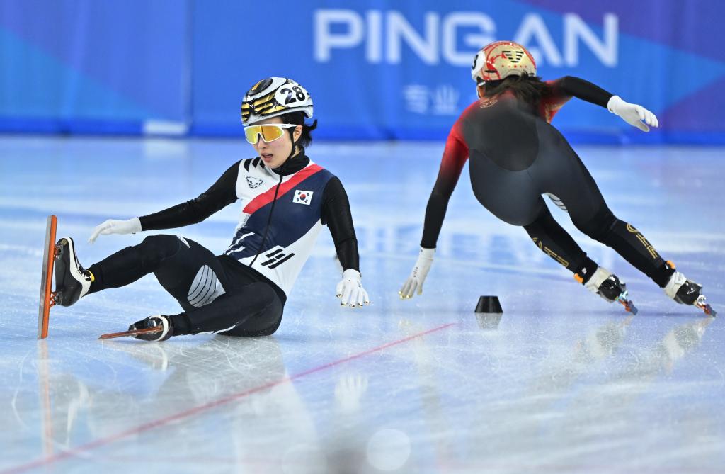 2月9日,中國(guó)隊(duì)選手公俐(右)在比賽中沖刺,韓國(guó)隊(duì)選手金吉莉在比賽中摔倒。新華社記者 江漢 攝