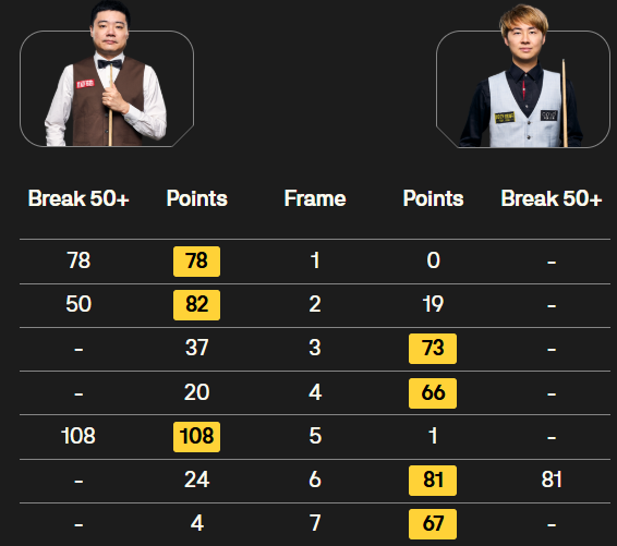 丁俊暉與徐思比賽的比分?jǐn)?shù)據(jù)。圖片來(lái)自斯諾克世界大獎(jiǎng)賽官網(wǎng)