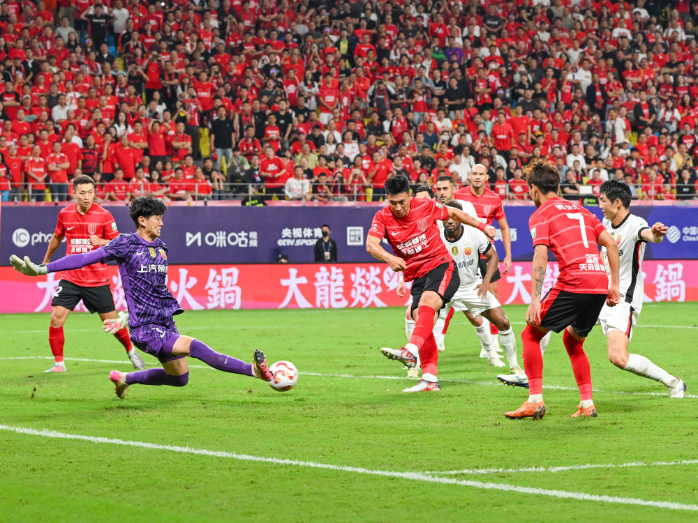 8月30日,成都蓉城隊球員楊帥(左三)在比賽中射門。當日,在四川成都進行的中國足球超級聯(lián)賽第23輪比賽中,成都蓉城隊主場4:1戰(zhàn)勝上海海港隊。新華社記者 王曦 攝