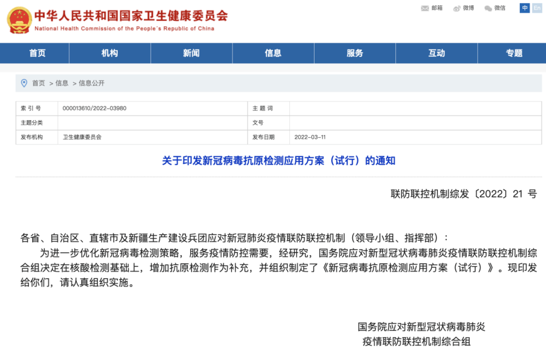 通知指出,為進一步優(yōu)化新冠病毒檢測策略,服務疫情防控需要,經(jīng)研究,國務院應對新型冠狀病毒肺炎疫情聯(lián)防聯(lián)控機制綜合組決定在核酸檢測基礎(chǔ)上,增加抗原檢測作為補充。