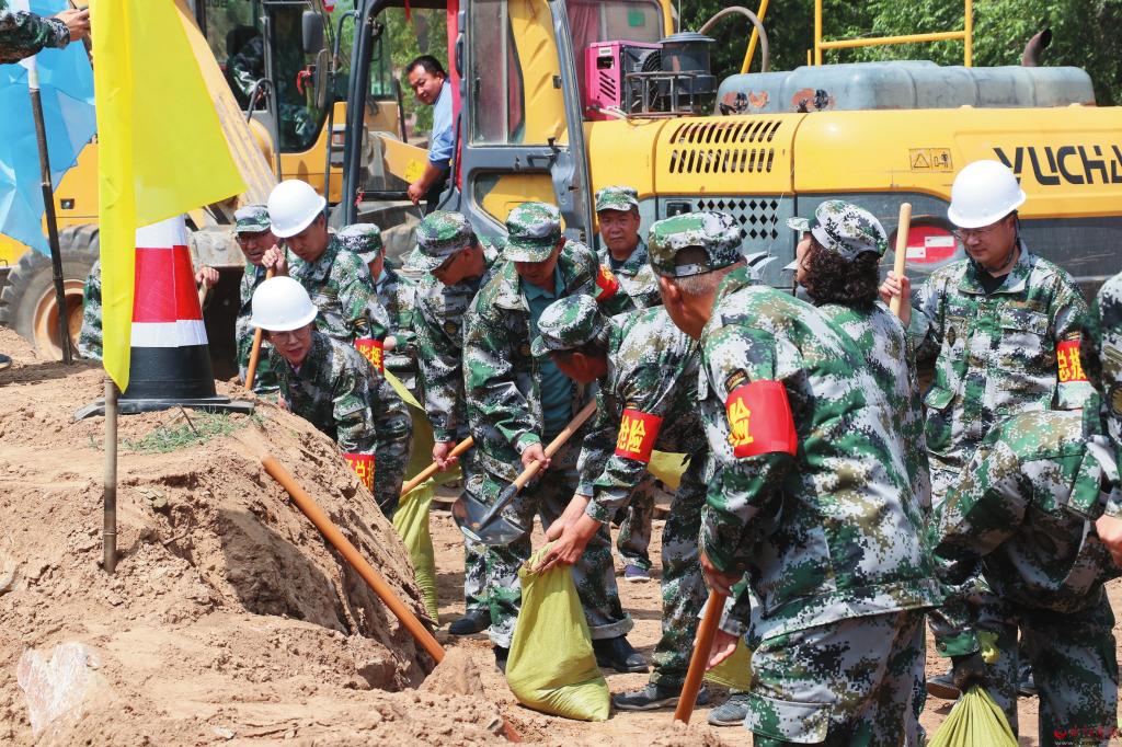 6月12日,原平市交通建設(shè)中心舉行了防汛應(yīng)急搶險(xiǎn)演練,檢驗(yàn)了全體職工防汛搶險(xiǎn)組織能力、快速反應(yīng)能力和現(xiàn)場操作能力,全力確保安全度汛。圖為演練人員裝土袋搶修變道。(劉建春 攝)