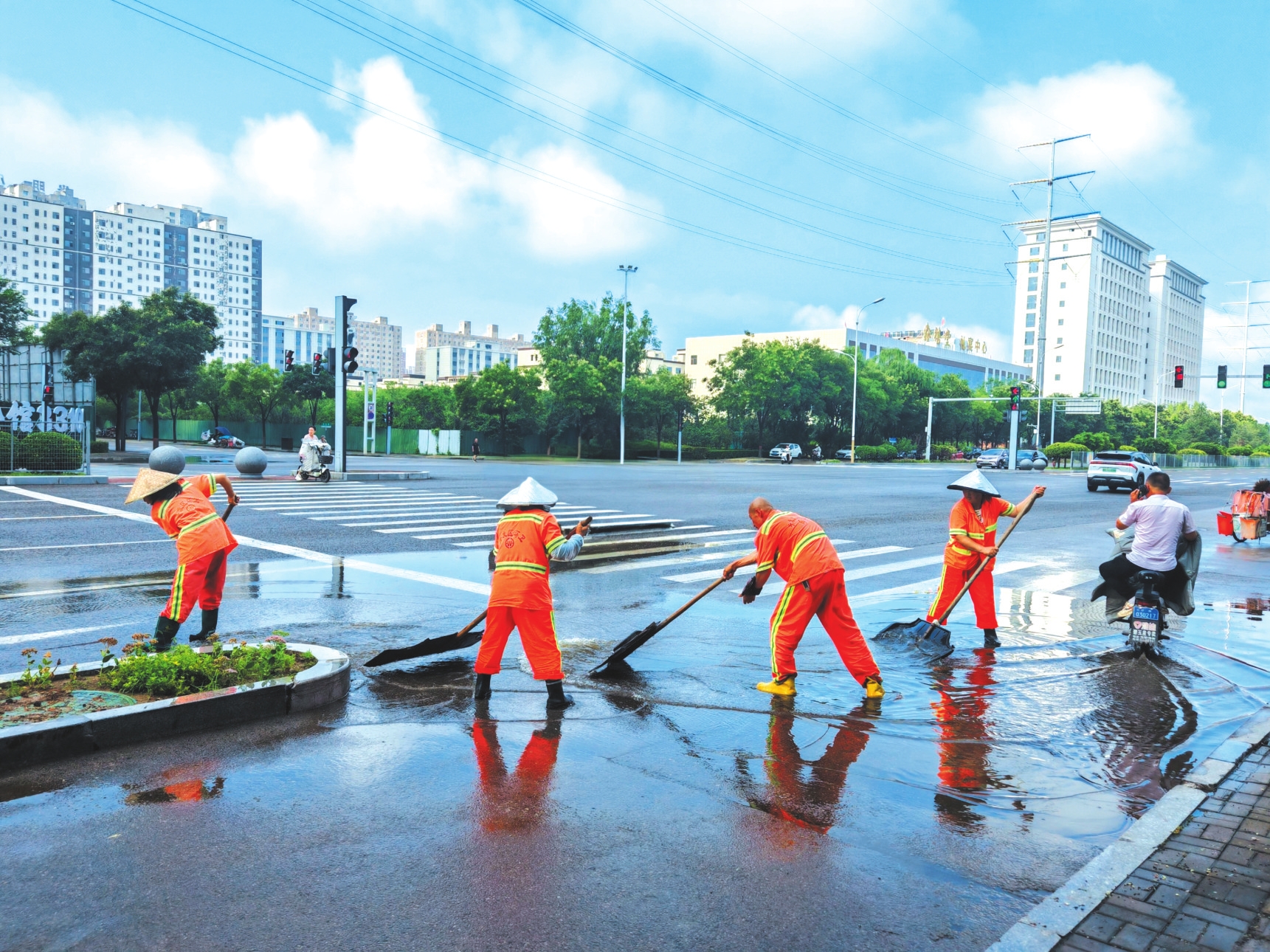 8月5日凌晨,我市降雨天氣造成城區(qū)部分道路路面積水。清晨,環(huán)衛(wèi)工人積極應(yīng)對雨情,對轄區(qū)內(nèi)路段開展排水清淤工作,保障市民日常出行。圖為環(huán)衛(wèi)工人在紫檀街路口清理積水。本報記者王陽攝