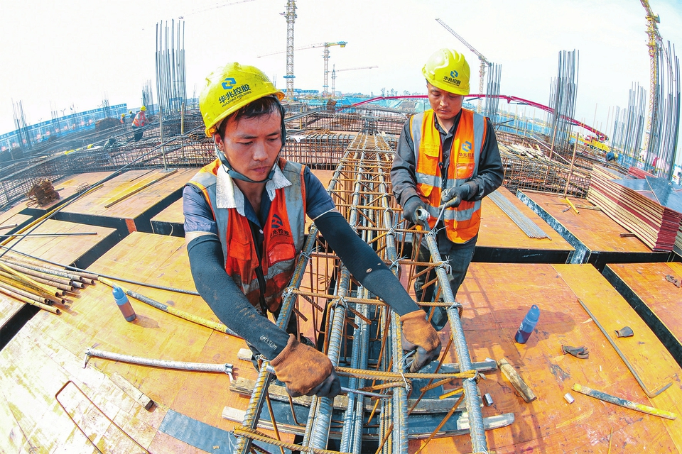10月1日,建筑工人正在運(yùn)城市會(huì)展中心項(xiàng)目建設(shè)工地做基礎(chǔ)施工。國(guó)慶長(zhǎng)假期間,承建總建筑面積82萬(wàn)平方米會(huì)展中心項(xiàng)目的運(yùn)城市建工集團(tuán)200余名建筑工人,堅(jiān)守施工一線,嚴(yán)格按照時(shí)間表、路線圖,采取人休機(jī)不停的晝夜輪班制施工,確保重點(diǎn)項(xiàng)目的有序推進(jìn)。(姜樺攝)