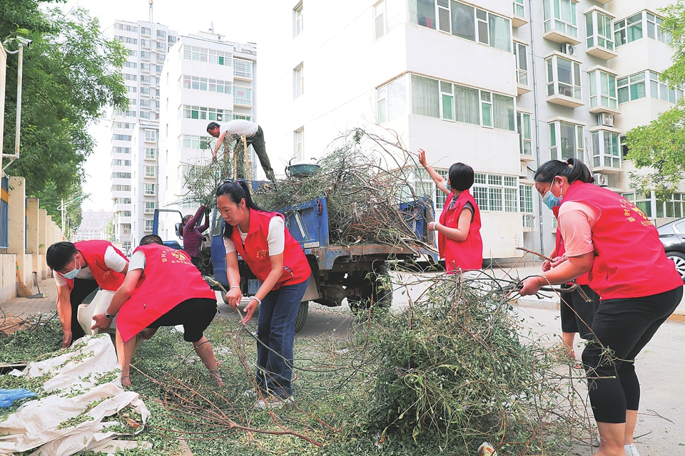 志愿者正在清理小區(qū)內(nèi)垃圾。 本報記者馮毅松攝