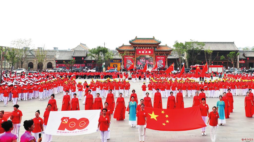 頌歌獻(xiàn)給黨,啟航新征程。在中國(guó)共產(chǎn)黨成立100周年之際,千余人歡聚忻州古城廣場(chǎng),群情昂揚(yáng)、載歌載舞喜慶黨的百年華誕。 張存良攝