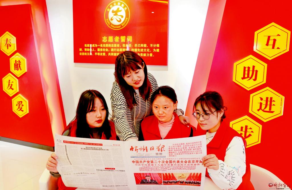 10月19日,忻府區(qū)新時代文明實踐中心工作人員正在閱讀報紙,學習黨的二十大報告。 (本報記者 張存良攝)