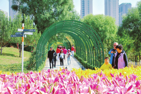 10月11日,正逢重陽,太原市晉陽湖公園內(nèi)百合盛放、美不勝收,吸引了眾多市民前來觀賞。 趙夏雨攝