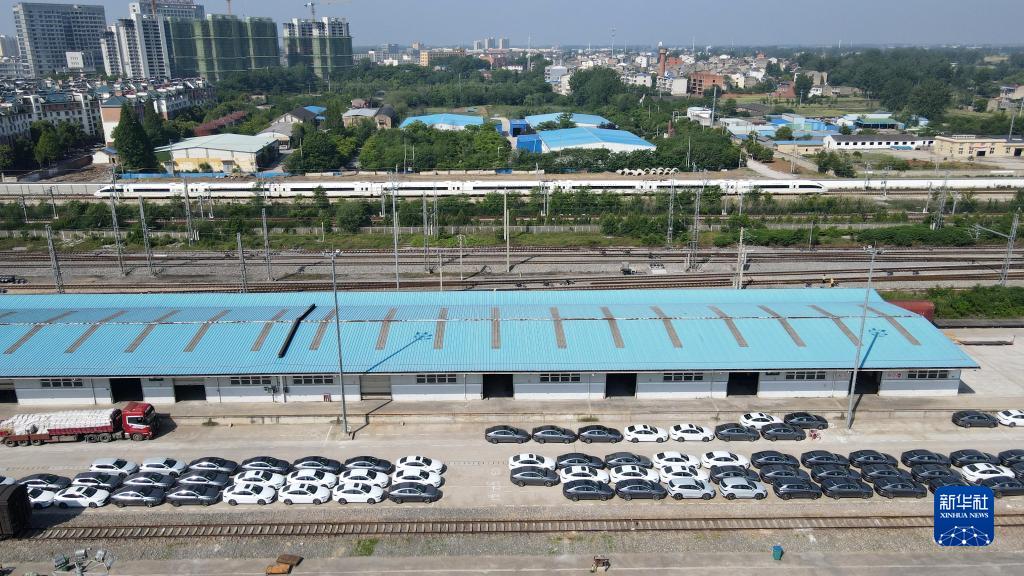 這是位于合肥市長(zhǎng)豐縣的鐵路水家湖貨運(yùn)站等待裝車外運(yùn)的新能源汽車(5月9日,無(wú)人機(jī)照片)。新華社記者 劉軍喜 攝