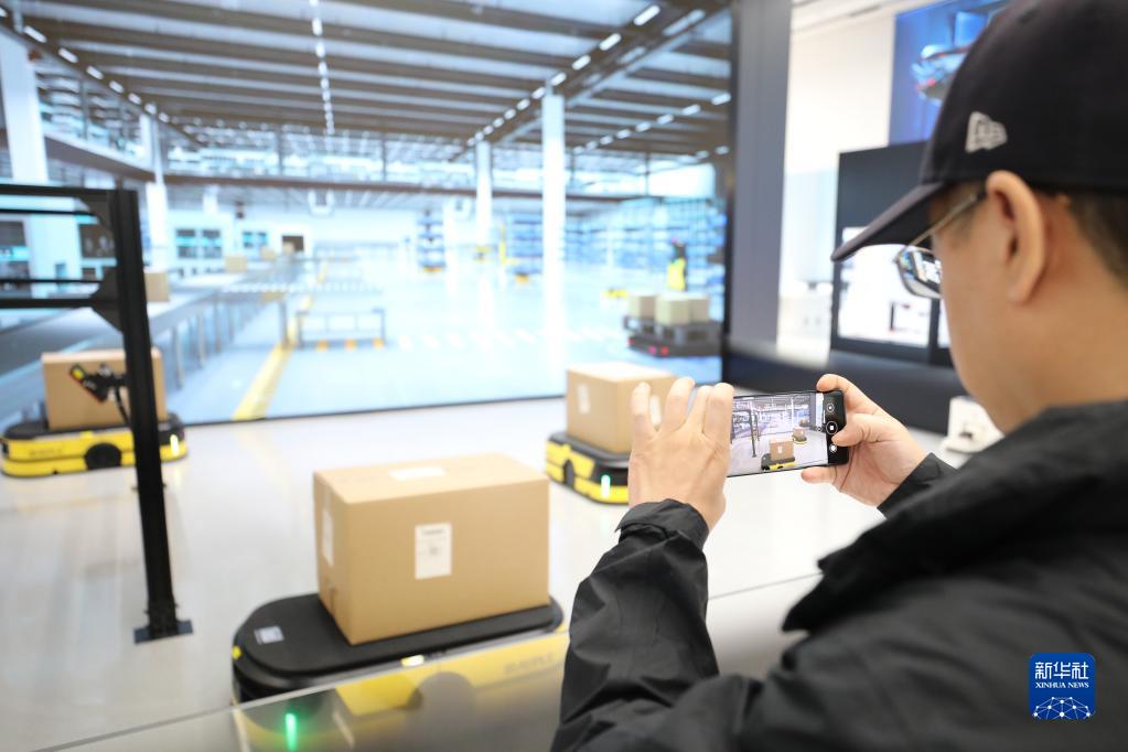 5月22日,參觀者在浙江大華技術股份有限公司的展廳內(nèi)拍攝一款智能運輸車。新華社記者 杜瀟逸 攝