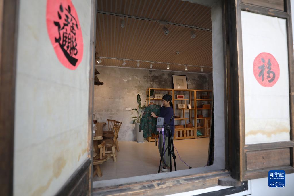 5月23日,在浙江省義烏市李祖村,創(chuàng)客鮑麗萍在店鋪里為網絡直播銷售做準備。