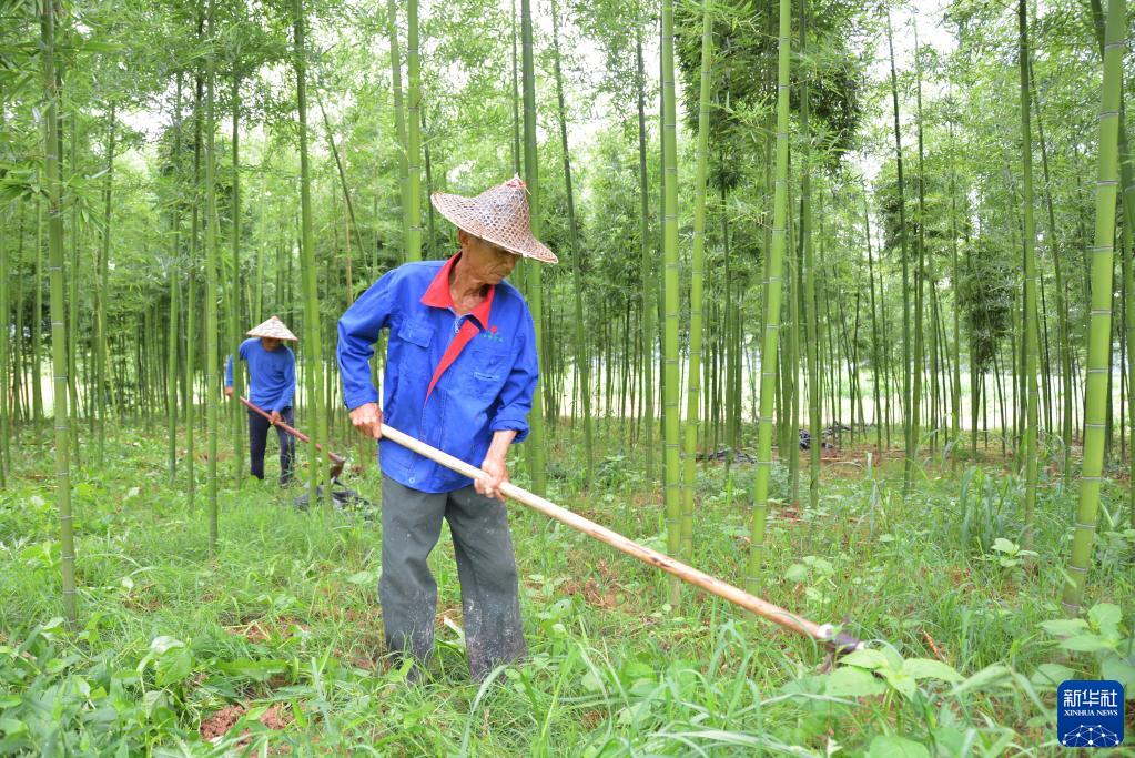 農戶在福建省建甌市井岐村一處雷竹林里鋤草(6月8日攝)。新華社記者 張華迎 攝