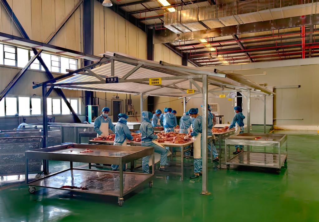 在海南紅焱食品有限公司廠房內(nèi),工人們正在學習牛肉分解。新華社記者吳茂輝 攝