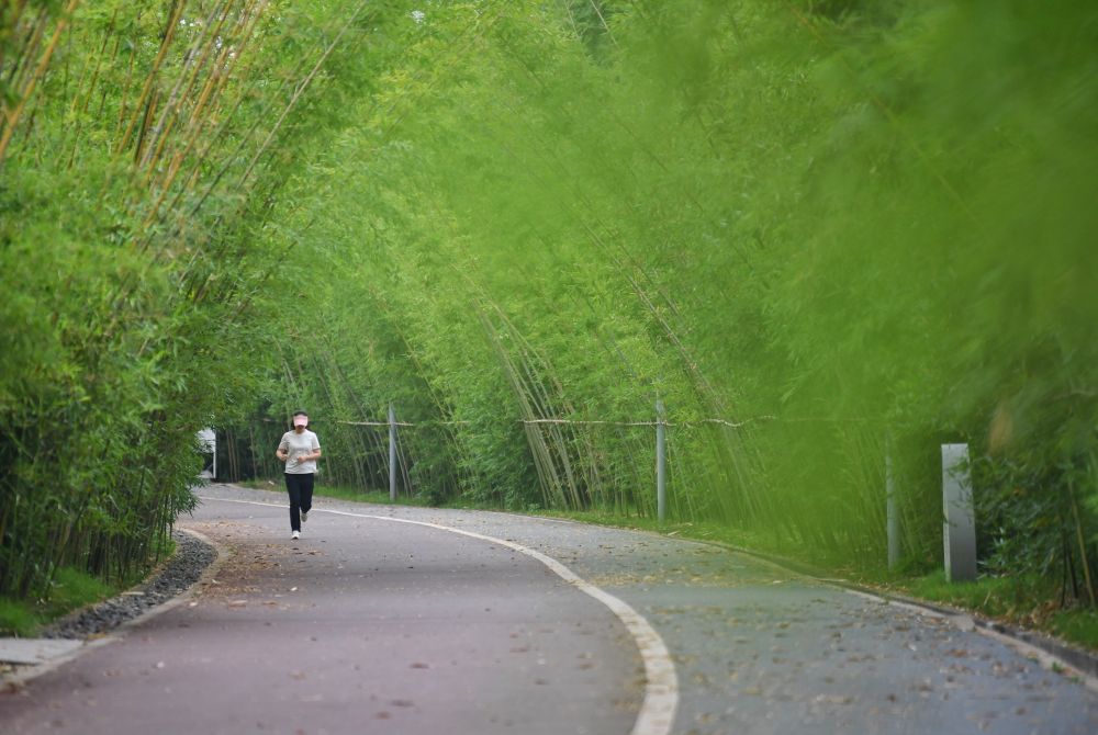 在四川省宜賓市江安縣長(zhǎng)江竹島,市民在由河中村改造成的綠色生態(tài)公園里跑步(2023年5月31日攝)。新華社記者 劉坤 攝