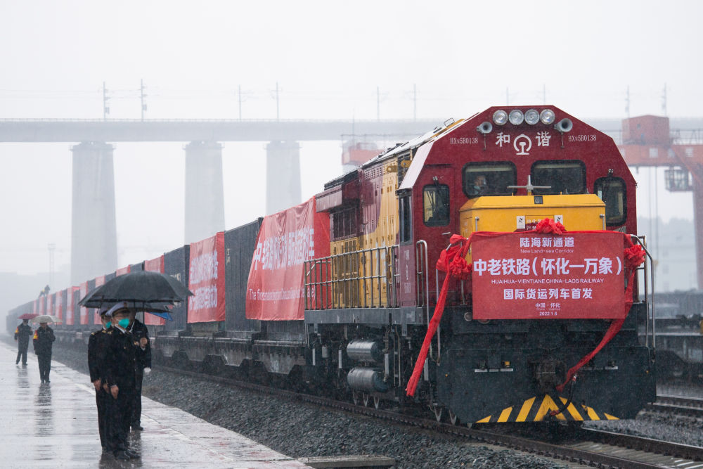 開(kāi)往老撾萬(wàn)象的中老鐵路(懷化—萬(wàn)象)國(guó)際貨運(yùn)列車在湖南懷化國(guó)際陸港準(zhǔn)備發(fā)車(2023年1月6日攝)。新華社記者 陳思汗 攝