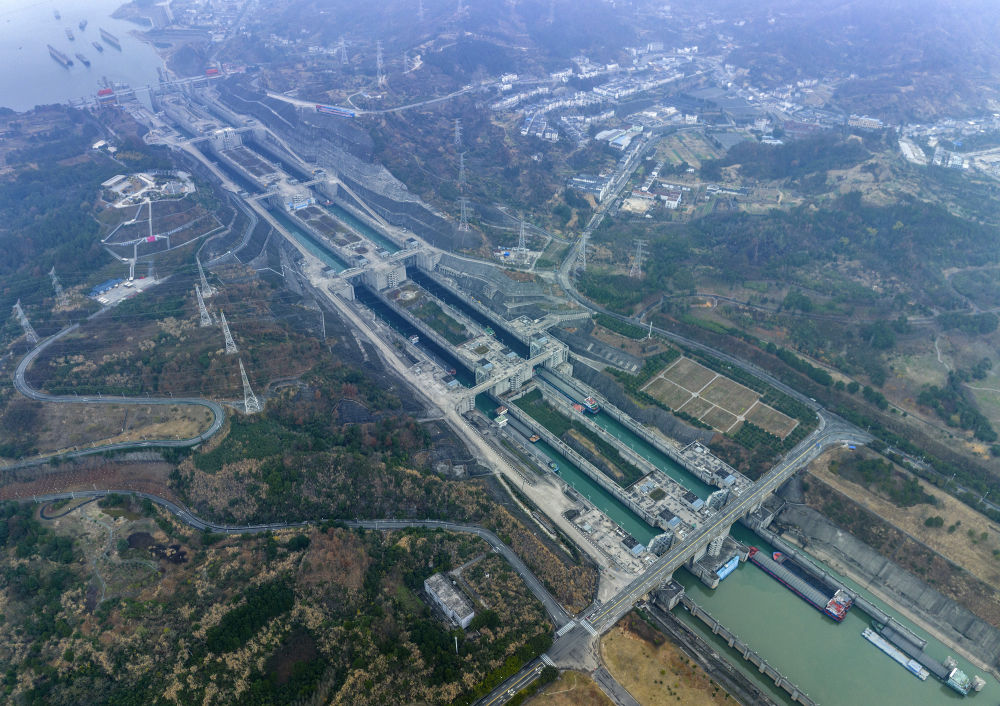 在湖北省宜昌市,船舶有序通過(guò)三峽樞紐五級(jí)船閘(2023年1月2日攝,無(wú)人機(jī)照片)。新華社發(fā)(王罡 攝)