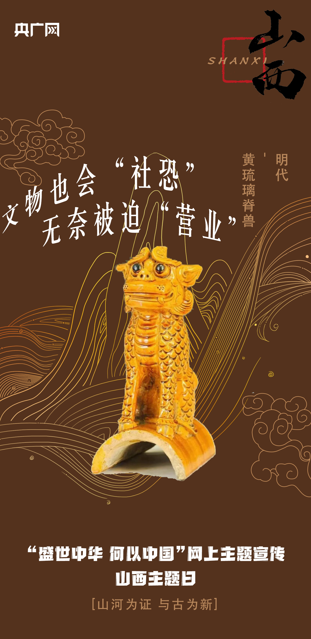明代黃琉璃脊獸。由山西晉中介休文化館于1984年9月移交至介休博物館收藏保護。琉璃走獸高31.7厘米,通體金黃,色澤飽滿,形態(tài)逼真,流光溢彩。因眉頭緊皺,瞪圓雙眼的呆萌表情,被網(wǎng)友戲稱為“未成年文物”。