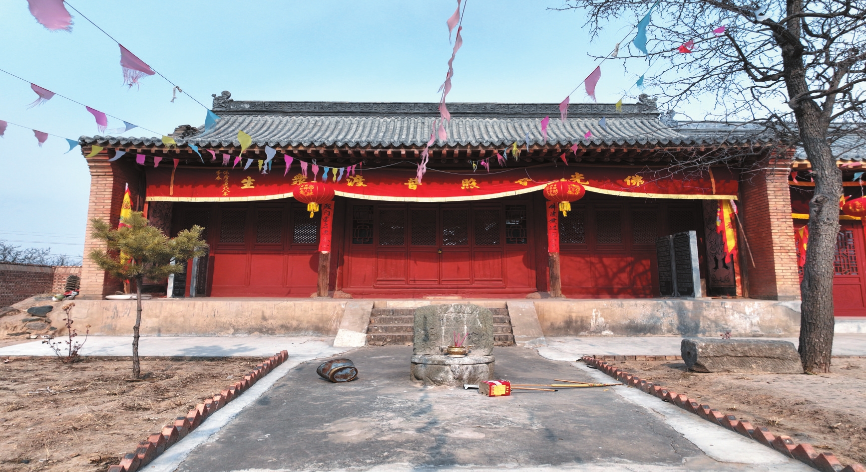嘉圣寺位于代縣棗林鎮(zhèn)顯旺村北,創(chuàng)建年代不詳。據(jù)過殿題記載,明正德十六年(1521)重修。該寺坐北朝南,占地面積3295平方米,三進(jìn)院落布局,中軸線上依次建有戲臺(tái)、過殿和正殿,兩側(cè)為東西配殿。過殿和正殿為明代建筑,其余皆為清代遺構(gòu)。過殿為石砌臺(tái)基,基寬11.2米、深9.3米、高1.3米,面寬三間,進(jìn)深四椽,單檐懸山頂,五檁無廊式構(gòu)架,裝修已毀。正殿為石砌臺(tái)基,基寬11.3米、深9米、高0.9米,面寬三間,進(jìn)深五椽,單檐硬山頂,六檁前廊式構(gòu)架,前檐明間和次間施四扇六抹格扇門。