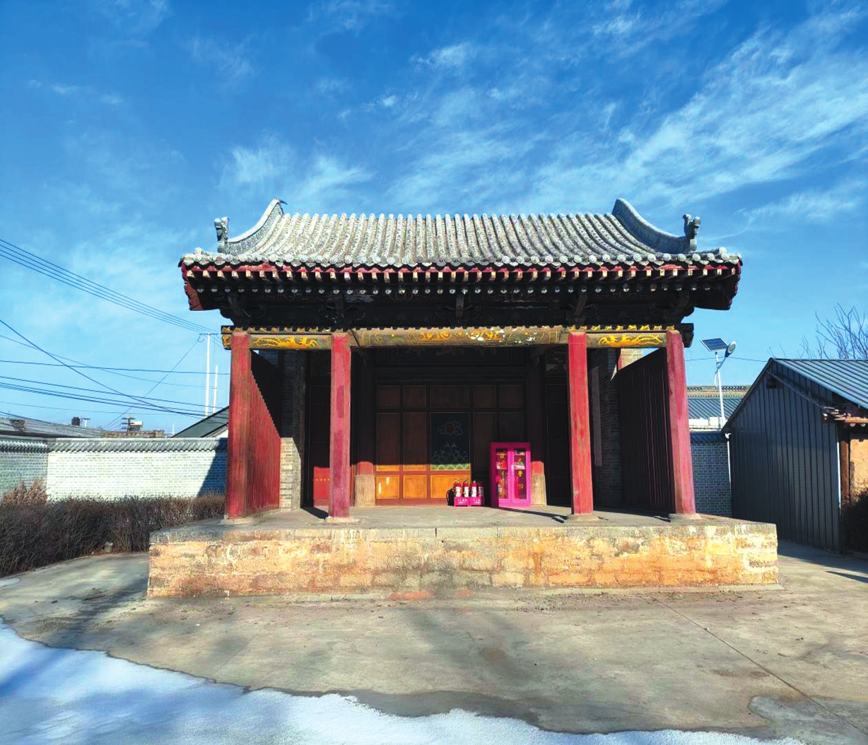 南街戲臺(tái),又名火神廟古戲臺(tái),位于五寨縣城南街南城門口、東七道街,是五寨縣重要的歷史文物遺存。南街戲臺(tái)創(chuàng)建于清道光三年(1823年),戲臺(tái)坐北朝南,面闊三間,總寬7.5米,樓高2.6米,硬山、博風(fēng)、卷棚式灰瓦布頂,斗拱獸頭為象首形。戲臺(tái)進(jìn)深四椽,前后臺(tái)之間設(shè)有隔斷,隔斷上鑲嵌牌匾,上款題“道光癸未”,匾刻“歌且舞”,落款為賈起蛟題。出將、入相轅門上額及墻壁檐柱均有精美彩繪圖案。