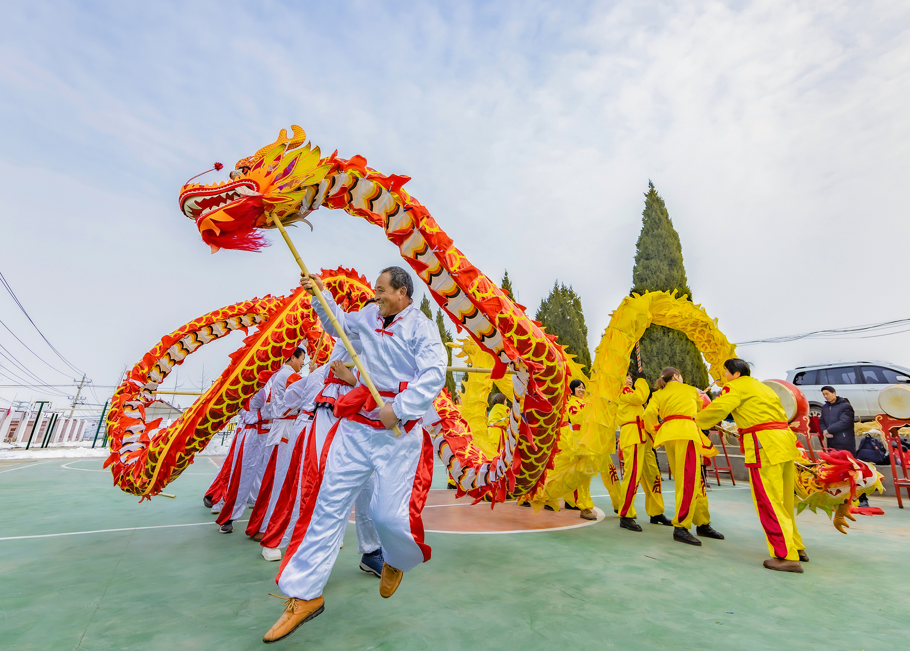 △ 江蘇宿遷兩支舞龍隊(duì)正在為村民表演雙龍狂舞鬧新春。