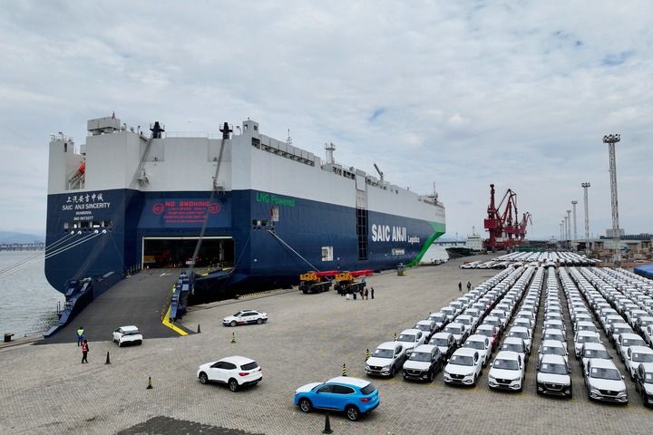 2024年1月23日,在福建廈門東渡港區(qū)現(xiàn)代碼頭,出口車輛陸續(xù)駛上“上汽安吉申誠(chéng)”號(hào)汽車滾裝船(無(wú)人機(jī)照片)。新華社記者 姜克紅 攝