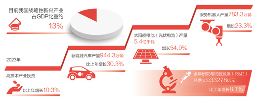 發(fā)展壯大戰(zhàn)略性新興產(chǎn)業(yè)?!皯?zhàn)略性新興產(chǎn)業(yè)具有創(chuàng)新活躍、技術(shù)密集等特點(diǎn),為新質(zhì)生產(chǎn)力發(fā)展壯大提供了巨大空間?!备呶拇碚f(shuō),近年來(lái),我國(guó)戰(zhàn)略性新興產(chǎn)業(yè)蓬勃發(fā)展,目前戰(zhàn)略性新興產(chǎn)業(yè)占GDP比重約13%。