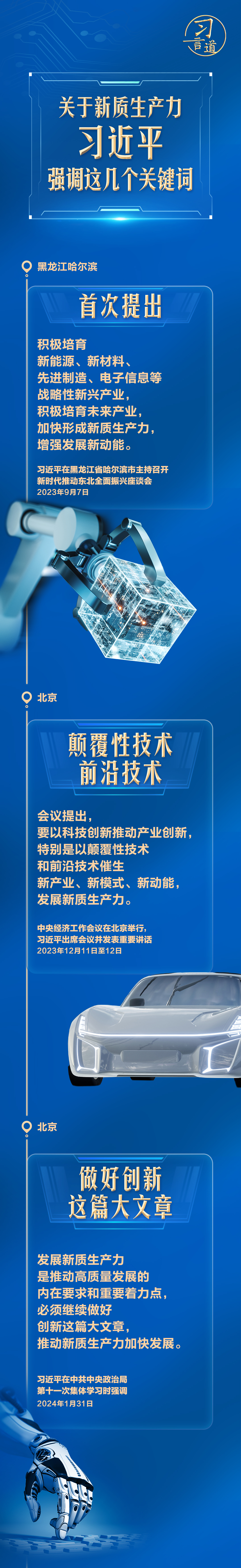 從去年9月在黑龍江考察時首次提出,到今年1月在中央政治局第十一次集體學習時系統(tǒng)闡述,再到此次兩會期間強調,習近平多次談到新質生產力。讓我們沿著總書記的足跡,一起研讀。
