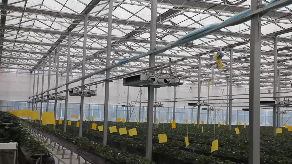 智慧農(nóng)場玻璃溫室現(xiàn)共種植三個品種、八萬株草莓,均為自主繁育的草莓苗。科學(xué)種植促進(jìn)了豐產(chǎn),兩座玻璃溫室均可實(shí)現(xiàn)一年四季連續(xù)生產(chǎn)。