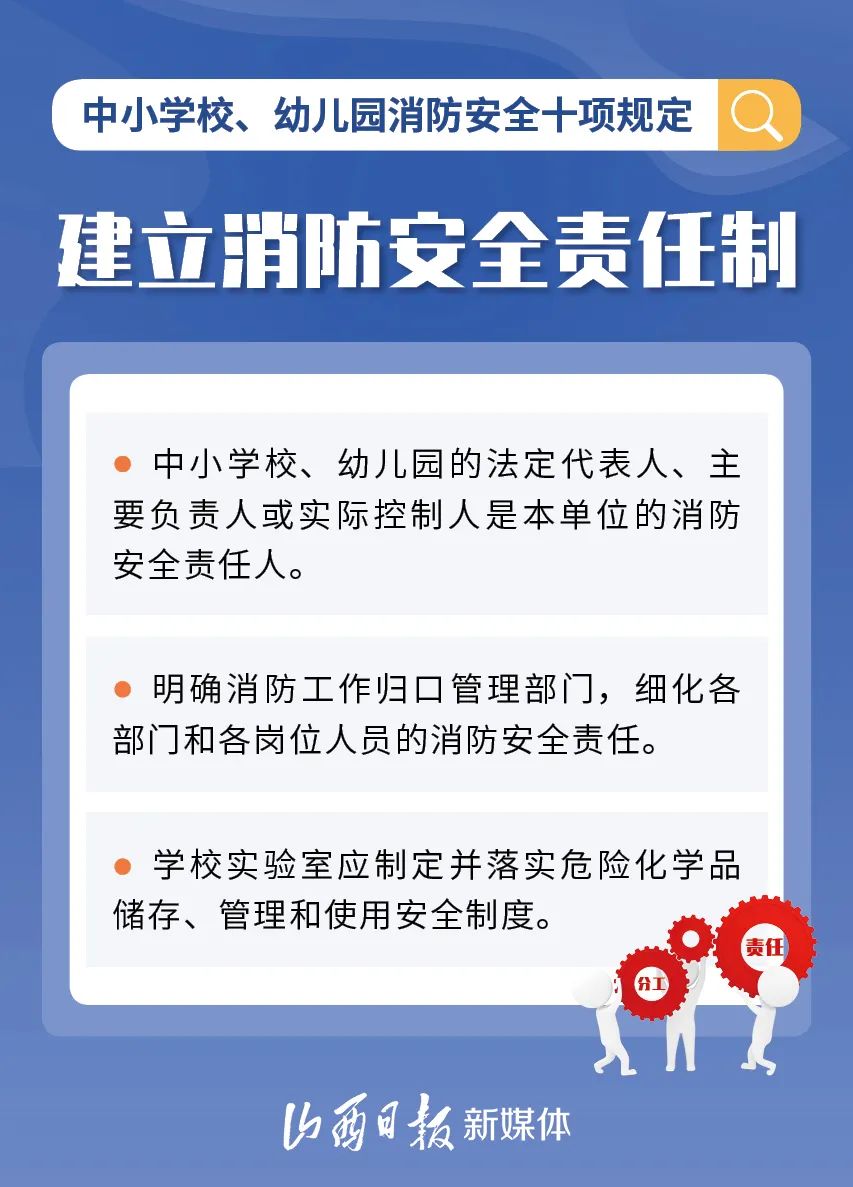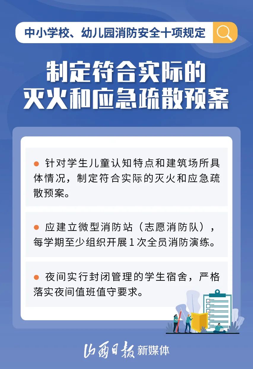 為加強(qiáng)中小學(xué)校、幼兒園消防安全管理,近日,教育部、國家消防救援局研究制定了《中小學(xué)校、幼兒園消防安全十項(xiàng)規(guī)定》,具體規(guī)定內(nèi)容如下。