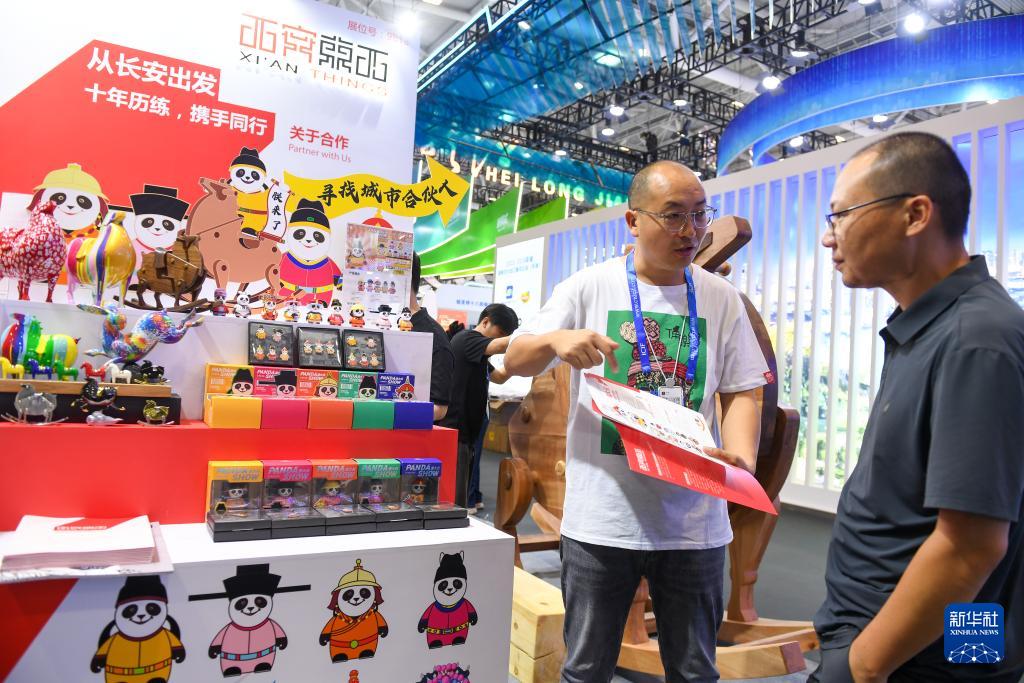 5月23日,參展商在第二十屆文博會上向參觀者介紹文創(chuàng)產(chǎn)品。(新華社記者 毛思倩 攝)