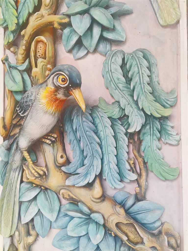 在海南的灰塑作品中,留白的運(yùn)用同樣有“以無勝有”的視覺效果?!盎宜茏髌飞饰宀拾邤?,一眼看過去容易產(chǎn)生錯亂的感覺,這時候留白就顯得很重要?!卞竞iw酒店負(fù)責(zé)人符燕舞說,灰塑作品有明顯的寫實(shí)風(fēng)格,所呈現(xiàn)的物象紛繁多彩。如果要將灰塑作為一種藝術(shù)品保留下來,用留白的手法為作品增添美感十分必要。