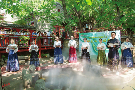 在太山景區(qū)售票廳里,背誦古詩(shī)詞免門票的活動(dòng)吸引了不少18周歲以下的學(xué)生參加,大家通過(guò)轉(zhuǎn)盤選定需要背誦的古詩(shī)詞,完成背誦即可獲得門票一張?!昂屯瑢W(xué)們正好一塊兒來(lái)了,通過(guò)參加這個(gè)活動(dòng),弘揚(yáng)我們的傳統(tǒng)文化,是非常有意義的。”今年暑期,太山景區(qū)面向廣大學(xué)生推出皮影戲、手工DIY印章、拓印等非遺體驗(yàn)活動(dòng)。同時(shí),景區(qū)還準(zhǔn)備了2000多套漢服,免費(fèi)為游客提供。