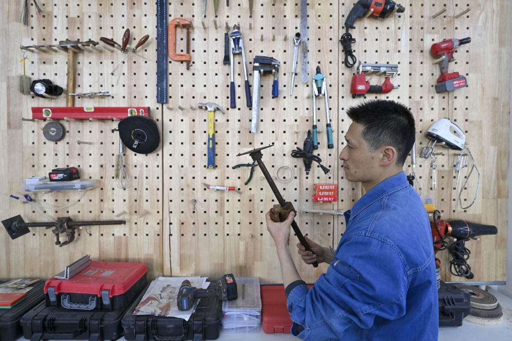 4月15日,在云岡研究院可移動(dòng)文物修復(fù)室,工作人員孫麗娜在進(jìn)行鐵器修復(fù)。