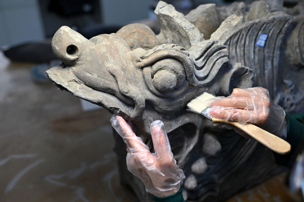 4月15日,在云岡研究院可移動(dòng)文物修復(fù)室,工作人員在進(jìn)行除塵作業(yè)。