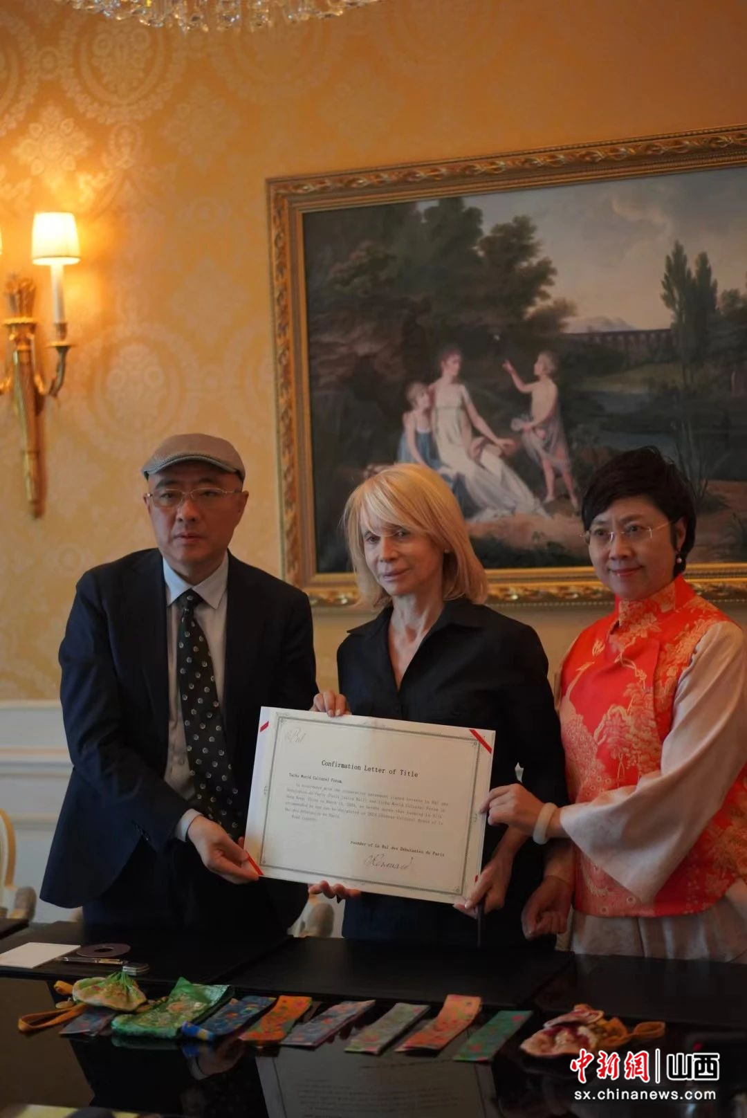 圖為:太湖世界文化論壇副主席兼秘書長(zhǎng)鄭傳焮(左)、巴黎名媛舞會(huì)創(chuàng)始人奧菲莉·雷努阿(中)、中國(guó)國(guó)家級(jí)非物質(zhì)遺產(chǎn)保護(hù)織造技藝(潞綢)傳承人王淑琴在簽約儀式現(xiàn)場(chǎng)。