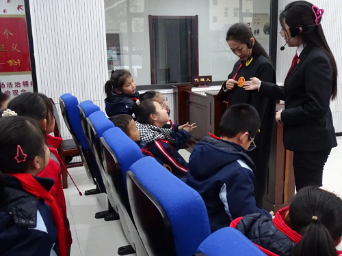在審判法庭,法院干警深入淺出地向?qū)W生們介紹了法庭的分設(shè)區(qū)域、庭審流程、訴訟參與人、法槌起源和具體的使用方法。通過互換角色的“沉浸式”體驗(yàn),法律不僅僅是教科書中枯燥無味的文字,法庭的莊重與法律的嚴(yán)謹(jǐn)已化作一幅幅生動(dòng)的畫面,深深烙印在他們的記憶中。