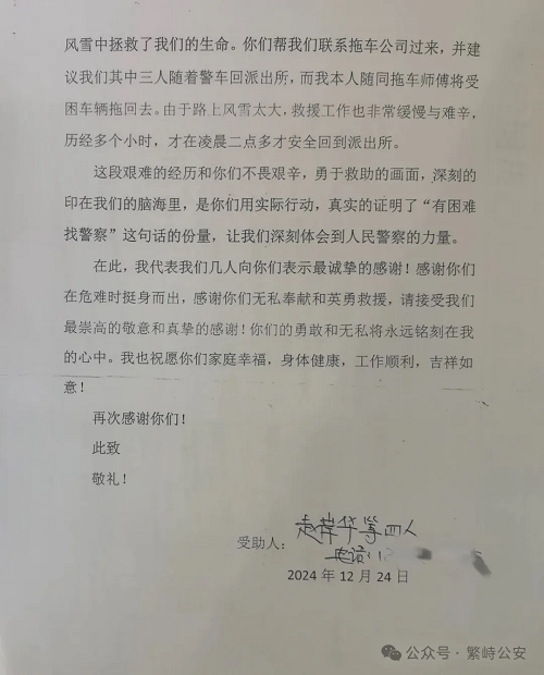 2025年1月1日,繁峙縣公安局收到了來自廣東省佛山市市民趙岸華等4人聯(lián)名寄來的感謝信,信中表達(dá)了對(duì)繁峙公安局神堂堡派出所民警頂風(fēng)冒雪深夜馳援,及時(shí)救助其脫險(xiǎn)的感激之情。