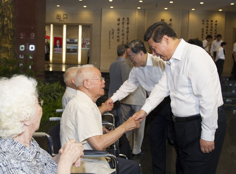 2014年7月7日,首都各界在中國人民抗日戰(zhàn)爭紀念館隆重集會,紀念全民族抗戰(zhàn)爆發(fā)77周年。習近平出席紀念儀式并發(fā)表重要講話。這是參觀結(jié)束后,習近平等親切看望參加儀式的抗戰(zhàn)老戰(zhàn)士和老同志代表。